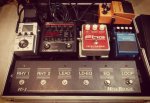 Infine ecco la sua pedaliera che utilizzo con altri pedali, alcuni nella mandata effetti e alcuni dritti nell’in dell’ampli. La possibilità di accendere e spegnere l’equalizzatore mi fornisce un buon boost alla bisogna, mentre il pedale loop accende e spegne il canale degli effetti.