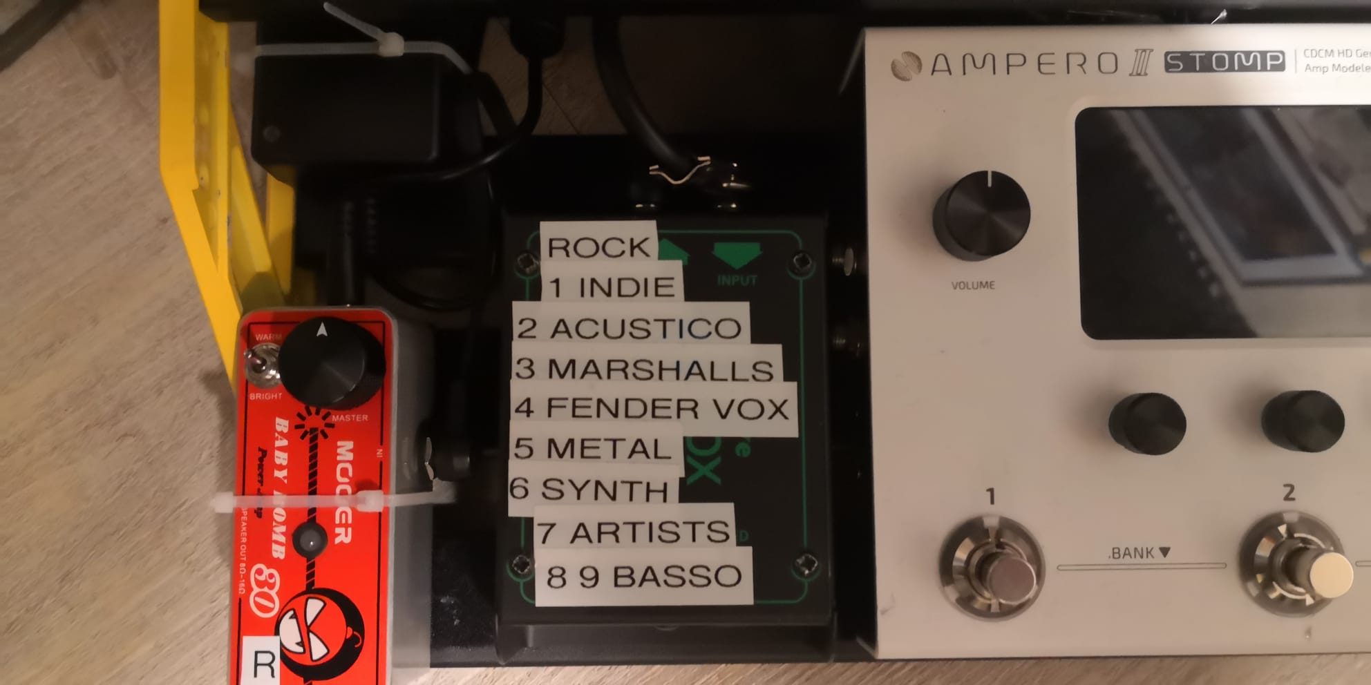 Qui vedete il mio Ampero con relativo BabyBomb Mooer che produce un bel suono settato come vedete in foto, ottenendo però anche un volume inutilizzabile su qualsiasi palco. Ho provato ad attaccare il Mooer al powersoak e dopo un po’ a cominciato a dare di matto spegnendosi ad intermittenza, evidentemente il finale in classe D a transistor mal si accoppia con un attenuatore, o con l’uscita eccessivamente alta del multiefx).